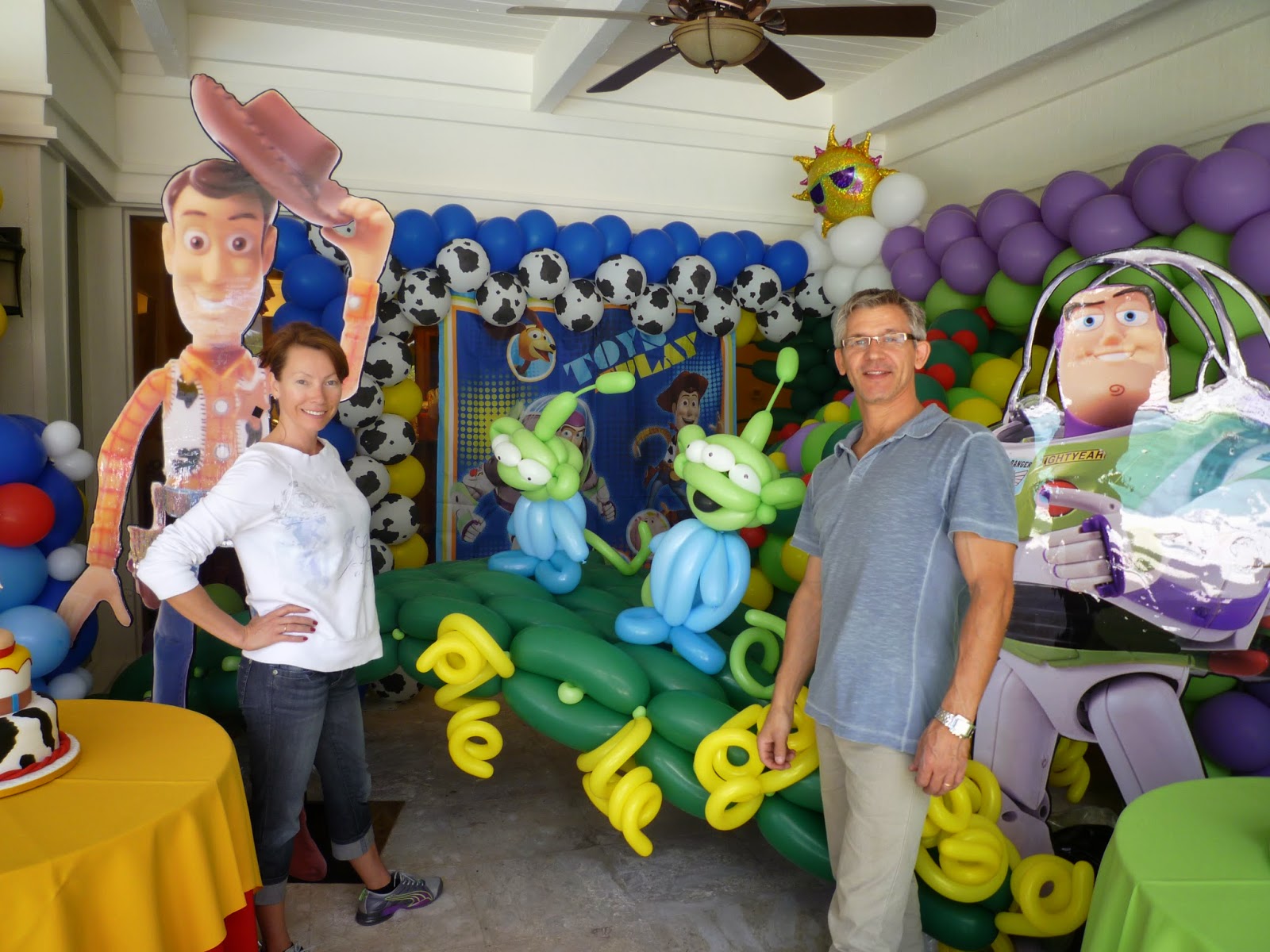 Toy Story themed balloon arch and balloon swags for outdoor kids party